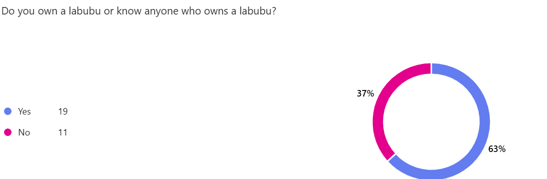 Additionally, Labubus have also gained popularity among the teenage population. In a recent survey conducted at Patriot High School, 63% of the 30 respondents stated that they either owned a Labubu themselves or knew someone who did.